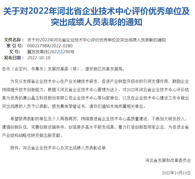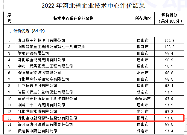 2022年10月10日,河北省发展和改革委员会印发《关于对2022年河北省企业技术中心评价优秀单位及突出成绩人员表彰的通知》,在本次参评666家省级企业技术中心中,河北金力新能源科技股份有限公司企业技术中心评价结果为“优秀”,评价得分97.8,位第13。