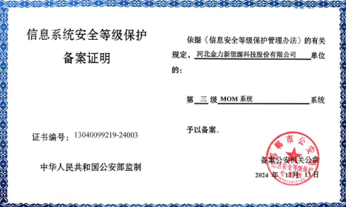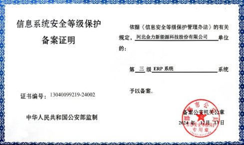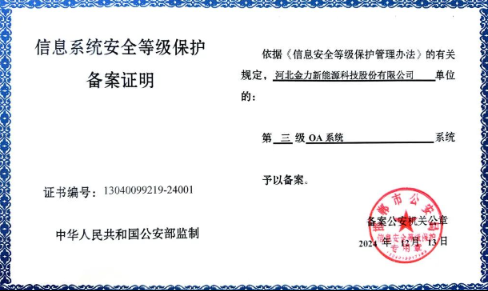 近日,金力股份mom系统、erp系统、oa系统,顺利通过国家信息系统安全等级保护测评,获得了由中华人民共和国公安部监制、邯郸市公安部门核准颁发的“信息系统安全等级保护三级备案证明”(以下简称“等保三级”)。